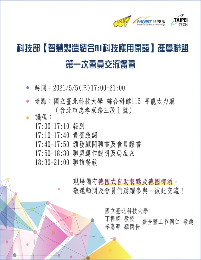 2021年5月5日科技部「智慧製造結合AI科技應用開發」產學聯盟第一次會員餐會邀請到工業局呂正華局長、德國經濟辦事處處長Axel Limberg、及億鈦科技、榮田精機、SRAM速聯、先鋒材料等公司多位業界菁英會員齊聚交流,大會圓滿成功。